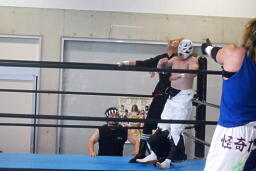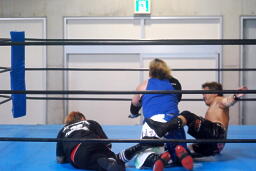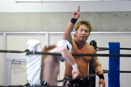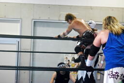 チョップの打ち合いから504サミング、ロープで顔面こすり(左写真)、魁にタッチ。魁チョーク攻撃。5分経過。