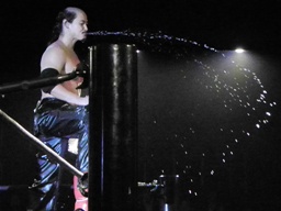 入場するといつものように水を噴きまくるシュウ(右写真)。