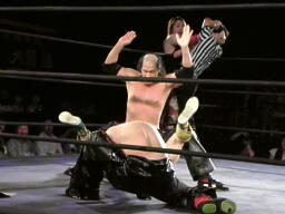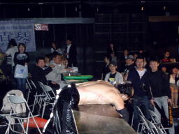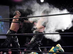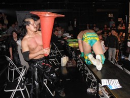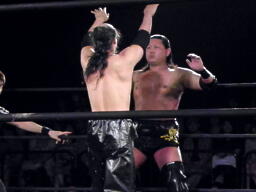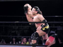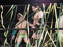 会場の隅でこれを見ていた大家が入って来て「これじゃまるで闘龍門じゃないか!だったら俺もだろうが!」とシャツを脱いで叫ぶが、大鷲は無視して「1、2、3、紅白プロレス合戦!」で締める(左写真)。