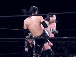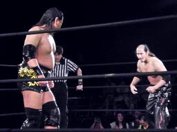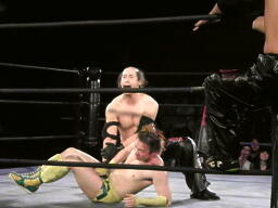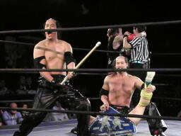 竹刀で叩く(左写真)。シュウがキック、カバー、オースギがカット。ケイがスーツケースで殴ってカバー、カウント2。
