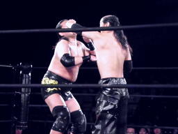 ロックアップ、大鷲がロープに押し込む、シュウ体勢を入れ替えるがクリーンブレーク(左写真)。