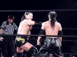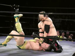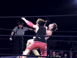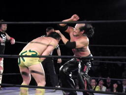 シュウミドルキック(左写真)、ロープに飛ぶ、大鷲キャッチしてスリーパーからドラゴンスリーパー、そして胸板にチョップ。シュウは場外エスケープ。千賀と菅原がリングイン。