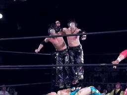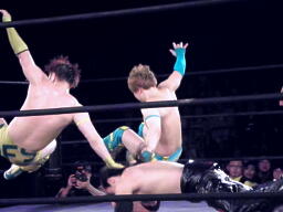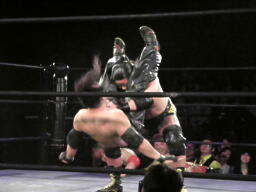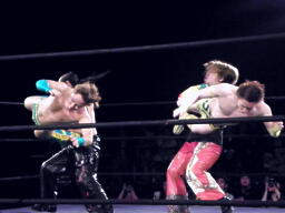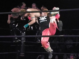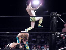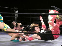 S.O.S.合体はバラモン兄弟にかわされるが、千賀がケイとオースギを踏み台にして串刺しドロップキック(右写真)、続いてオースギがギロチンドロップ。