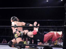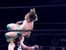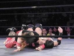 ダブルでフェースクラッシャー(左写真)、ダブルのフライングクロスアタック。オースギカバー、カウント2。