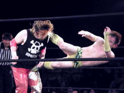 オースギ首投げ、ロープに飛んで顔面にドロップキック(右写真)、カウント2。千賀にタッチ。菅原と千賀エルボーの打ち合い、千賀をコーナーに振る、シュウが顔面に水、これを機に場外戦に。