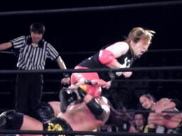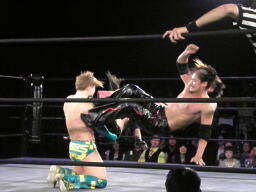 トリプルドロップキック(左写真)、ケイがカバーするがカウントは2。