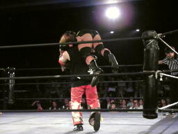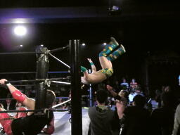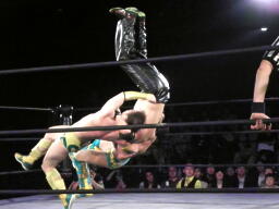 バラモン兄弟がコーナーに上り、菅原がバックフリップ(右写真)、