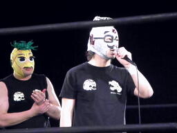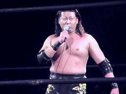 大鷲「ちゃんと順番は踏んでいる!えー、次は7月19日またここでやります。ここでやり続けられるような体力をつけたいと思います。闘龍門9期生がデビュー10周年になるので、バラモン兄弟vsマサ高梨&石森太二、このカードをプレゼントします。そして今日は私が復活しましたが、7月19日は高木“ジェット”省吾が復活します!」(左写真)