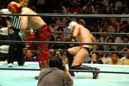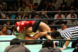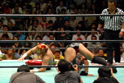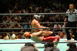 ヒート腕にキック、タイガースキャッチしてドラゴンスクリュー(左写真)、ヒート場外エスケープ。