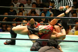 ヒートタイガースの手首をヒザ裏に固定してのフィッシャーマンバスター(左写真)、カウント2。
