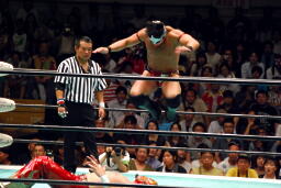 タイガース手刀打ち込んでコーナーに上るとダイビングダブルニードロップ、ヒートかわし(左写真)、