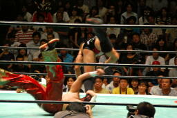 ヒートカウンターのドロップキック(左写真)、タイガース場外転落。