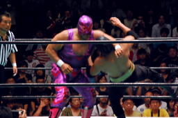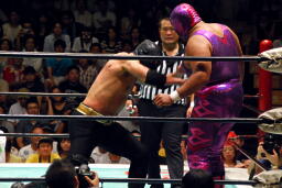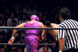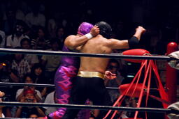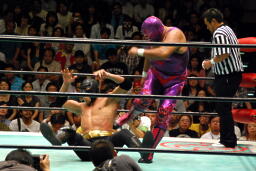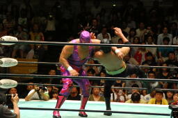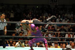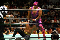 首相撲からのヒザ蹴り連打(左写真)、またDDT。サスケは場外エスケープ。ビジャノも追う。