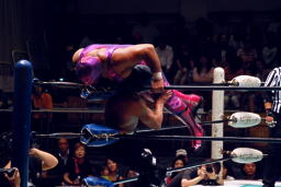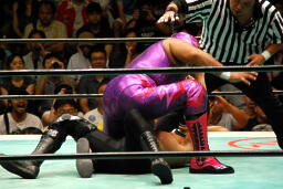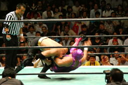 場外ブレーンバスター、リングに戻すとロープに振ってパワースラム(右写真)、カウント2。