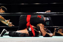 全体重をかけて押さえ込むが(右写真)カウントは2。拳王にはこんな形で勝ったが今日はダメか。