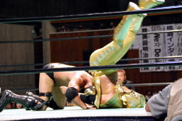 ウルティモカニばさみで倒してラ・マヒストラルに(左写真)、カウント2。もう一度ラ・マヒストラル、これもカウント2。