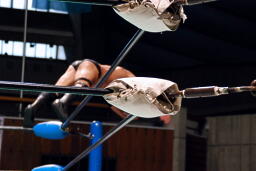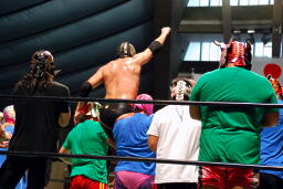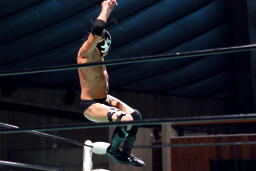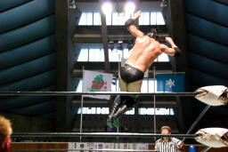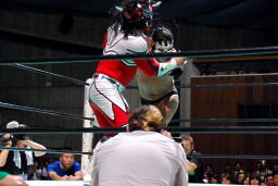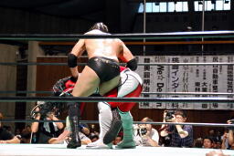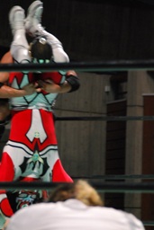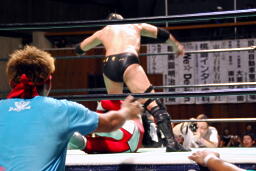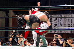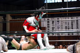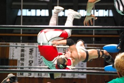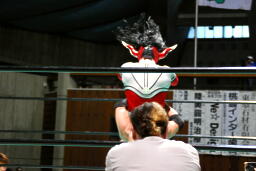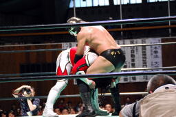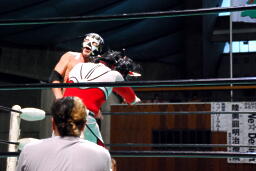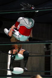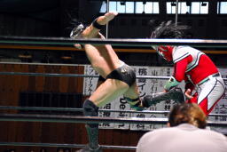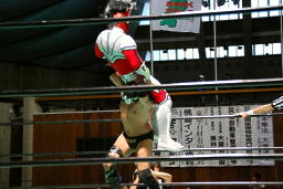 サスケライガーをコーナーに上げて雪崩式ブレーンバスター(右写真)、カウント2。