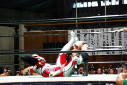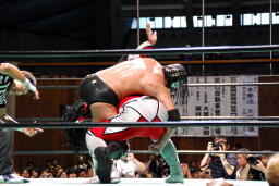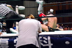ライガー掌底、サスケかわしてジャーマン(左写真)、カウント2。