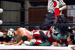 雪崩式フランケンシュタイナー(右写真)、サスケ回転エビ固めに切り返す、カウント2。