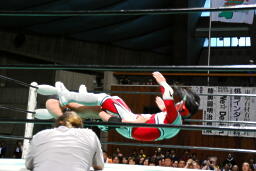 サスケは鉄柱攻撃、リングに戻ると鉄柱越えトペ・コン・ヒーロ(左写真)。サスケはカウント15、ライガーはカウント16でリングに戻る。