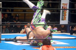 ミステリオッソは3発目をブロックしリバースパワースラム(左写真)、田口を顔面から落とす。カバーはカウント2。