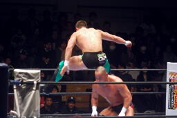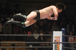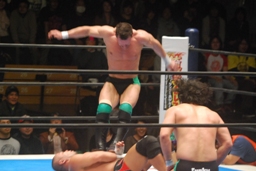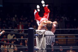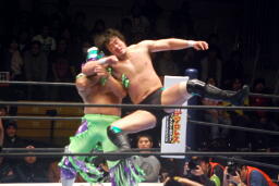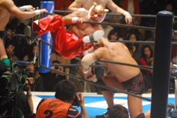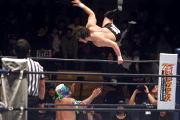 邪道がトラースキック、ミステリオッソドロップキック(右写真)。ミステリオッソコーナーに振って突っ込む、デヴィットカウンターのキック、ミステリオッソ再度突っ込んで串刺しラリアット。デヴィットドロップキック、タイガーにタッチ。
