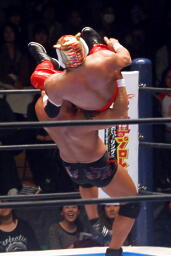 タイガーボディスラム、コーナーに上る、ミステリオッソがパンチ、邪道バックドロップ(右写真)、カウント2。