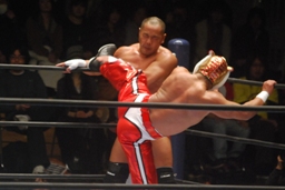 邪道がロープに飛ぶ、タイガーが戻ってカウンターのドロップキック(左写真)。