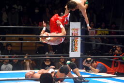 外道ヘッドロック、デヴィットロープに振る、外道ショルダーブロック。外道ロープに飛ぶ、デヴィットリープフロッグでかわし(右写真)フライングメイヤー、外道ヘッドシザーズ。