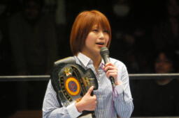 CMLL女子王者の栗原があいさつ(左写真)。緊張したのか物凄いグダグダに。