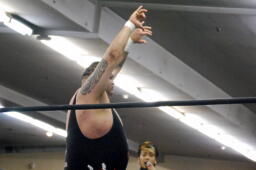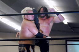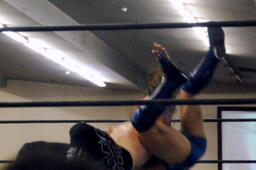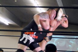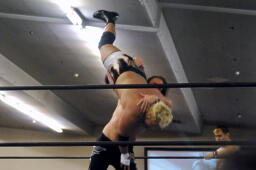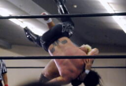 永田アーチャーをコーナーに振って突っ込む、アーチャーカウンターのキックからバックドロップ(左写真)、タイチがカバー、カウント2。