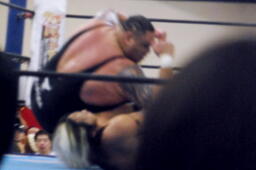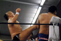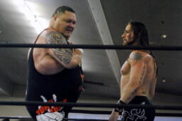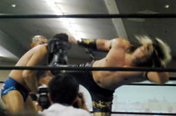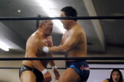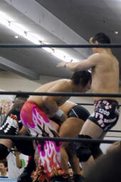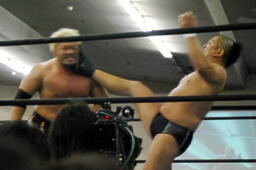 タイチとTAKA2人で突っ張り(右写真)、曙2人吹っ飛ばす、真壁にタッチ。鈴木もリングイン。