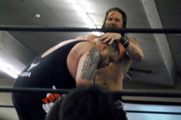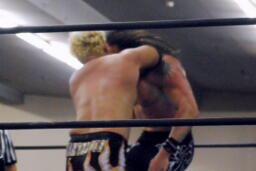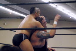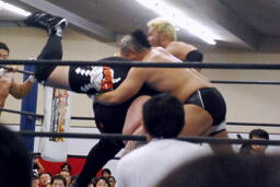 鈴木は曙にゴッチ式パイルドライバー狙う、井上が阻止に入るがTAKAが止める(左写真)。