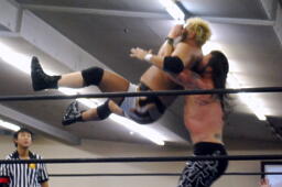 タイチロープに飛ぶ、曙カウンターのラリアット(左写真)、ボディプレスで3カウント。