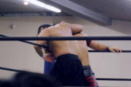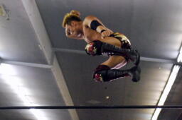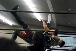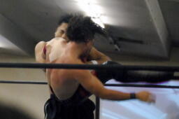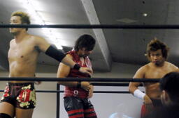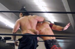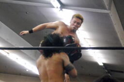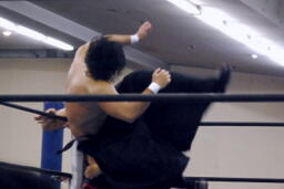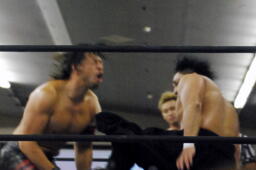 コーナーに振る、後藤切り返して串刺しラリアット(左写真)、コーナーに上る、YOSHI-HASHIが足を押さえる。