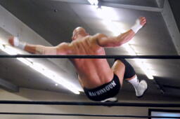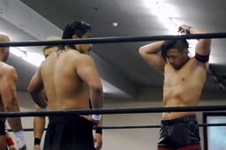 中邑睨み合うでもなく後藤と対峙(左写真)。この2人でスタート。ロックアップ、後藤がロープに押し込む、中邑切り返す。後藤ガットショット、ヘッドロック、中邑ロープに振る、後藤ショルダーブロック。後藤ロープに飛ぶ、中邑キチンシンク。