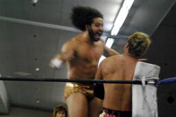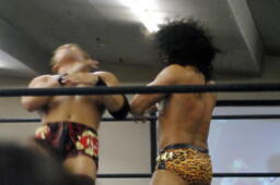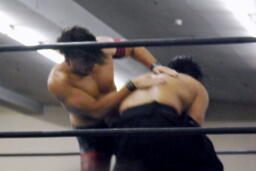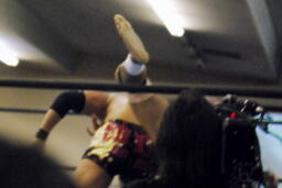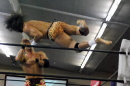 アンダーソン「ゴメンナサーイ!」セントーン(右写真)、タマも「ゴメンナサーイ!」エルボードロップ、カウント2。10分経過。