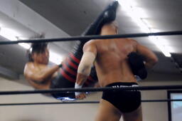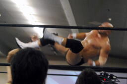 エルボースマッシュ、コーナーに振る、アンダーソンゼロ戦キック(右写真)、カウント2。場外に。