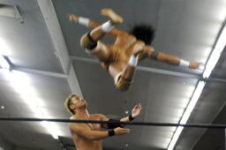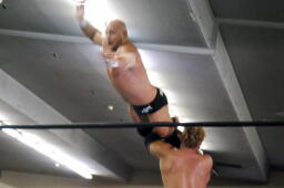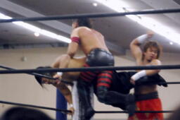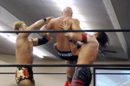 YOSHI-HASHI入って3人で合体パワーボム(右写真)、カウント2。5分経過。