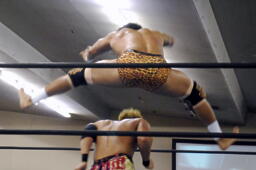 コーナーに上ってクロスボディ(左写真)、カウント2。