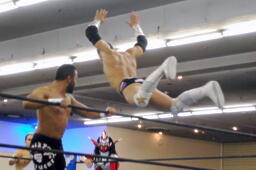 バックドロップは着地して逆さ押さえ込み、カウント2。ライガーコーナーに振って突っ込む、ロメロキャッチしてスイングDDT(左写真)、外道にタッチ。ライガーもマキシモにタッチ。