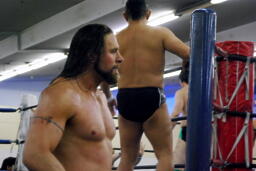 先発は真壁とアーチャー。ショルダーブロックの打ち合い、エルボーの打ち合い。真壁ビッグブーツ、アーチャー場外転落。アーチャーがリングサイドを徘徊(右写真)。田口とTAKAがリングイン。