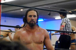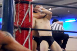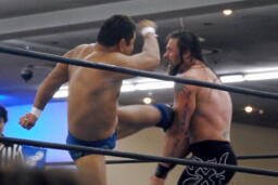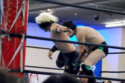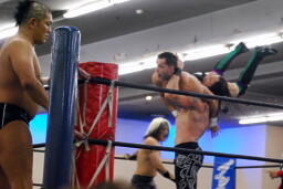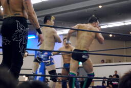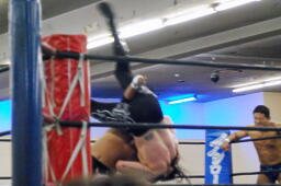 真壁がタイチ、TAKAににボディスラム、鈴木をコーナーに振って串刺しラリアットからコーナーパンチ連打(左写真)。真壁がブレーンバスター狙う、鈴木フロントネックロックに切り返す。鈴木ヒザ蹴り、アーチャーにタッチ。