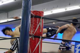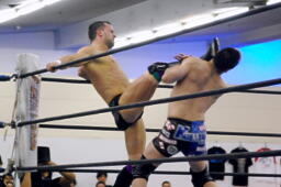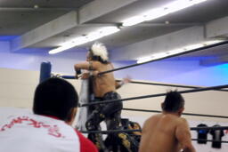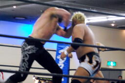 TAKA「行け、牧!」タイチはコーナーに振って串刺しラリアット(左写真)、TAKAは串刺しのヒザ蹴り。5分経過。アーチャーにタッチ。