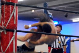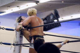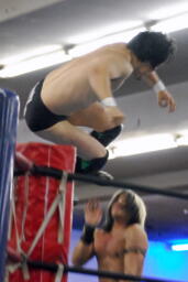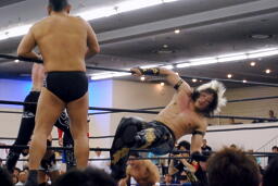 永田ロープに飛ぶ、アーチャーキャッチしてバックフリップ(右写真)、カウント2。田口とタイチにタッチ。10分経過。