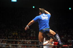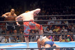 「行っちゃうぞバカヤロー!」からのダイビングエルボードロップ(右写真)、カウント2。