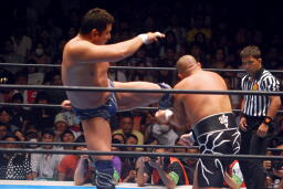 永田は矢野に延髄蹴り(右写真)、天山にタッチ。天山矢野にショルダーブロック、矢野は飯塚にタッチ。