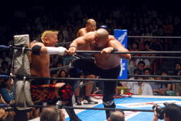 石井と矢野合体のネックブリーカー(右写真)、石井コーナーに振る、永田切り返してタイナー。
