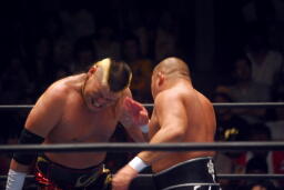 石井入って逆水平、張り手(左写真)、ヘッドバット、天山もヘッドバット。