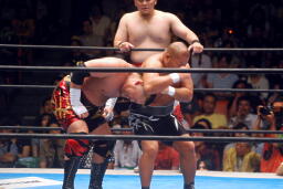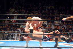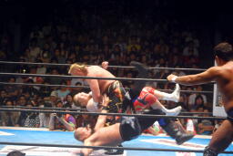 エルボーの打ち合い、小島ロープに走ろうとする、矢野は後ろ髪つかんで引き倒し(左写真)、「ヤノ、トー、ルー!」ポーズ。
